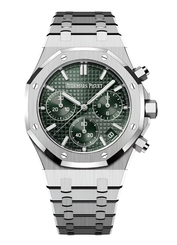 Unworn 2023 41mm Stainless Steel 26240ST Audemars Piguet Royal Oak Chronograph Green Dialon a FullStainless Steel Audemars Piguet Bracelet.